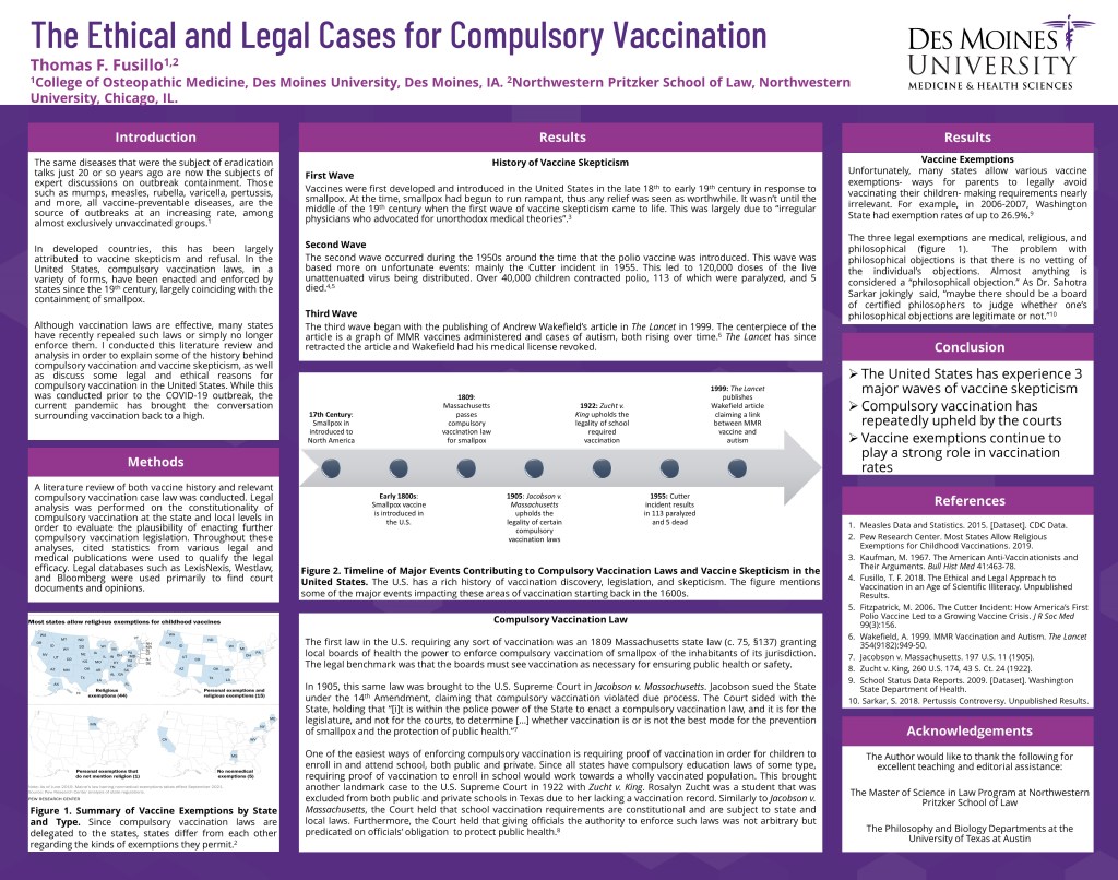 Diseases such as mumps, measles, rubella, varicella, pertussis, and more, all vaccine-preventable diseases, were the subject of eradication discussions in the not-too-distant past, at least in the western world. While research has shown that nearly all compulsory vaccination laws are safe and effective, there has been a resent regression of legislation and/or enforcement of these laws in the United States. I conducted a literature review of vaccine history as well as analyzed case law in order to substantiate the legality and ethics of compulsory vaccination. The first instance of compulsory vaccination was an 1809 Massachusetts law requiring smallpox vaccination. In 1905, the U.S. Supreme Court upheld that law in Jacobson v. Massachusetts, holding that jurisdictions have the right under certain circumstances to pass and enforce compulsory vaccination laws. While the Fourteenth Amendment puts the government under strict scrutiny when it restricts individual liberties, the Court confirmed that it is the legislature’s obligation to pass such laws. Furthermore, in Zucht v. King, the U.S. Supreme Court upheld the right of both public and private schools to require a vaccination record for entrance and attendance. The biggest obstacle to enforcing these laws has been vaccine exemptions. As of 2018, 50 states allowed medical exemptions, 47 allowed religious exemptions, and 17 allowed exemptions based on philosophical beliefs or reason of conscience. This third category is the largest of the three. Further analysis and discussion of this topic should be aimed at vaccination law in the age of COVID-19.